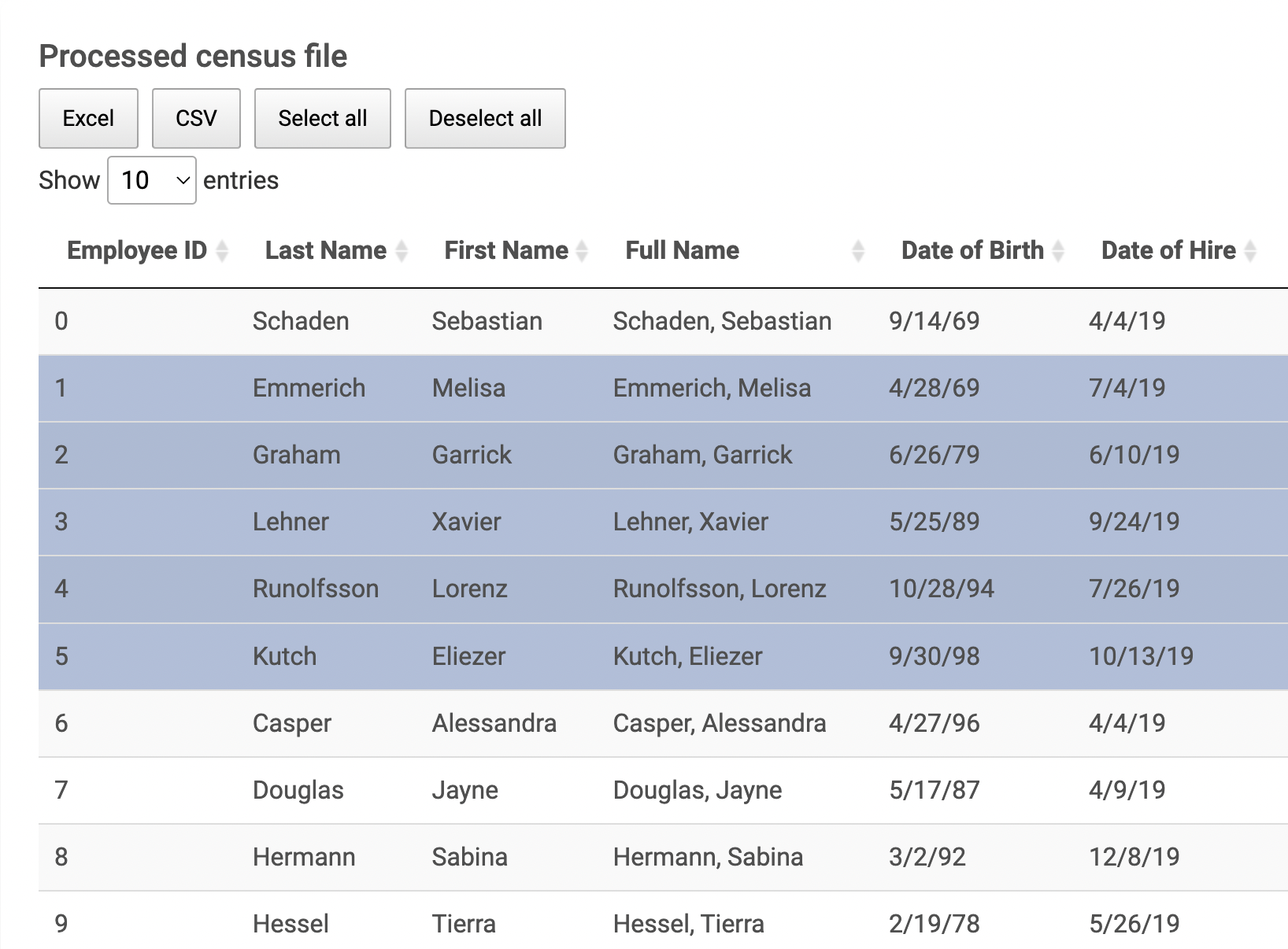 Download all processed records or only the newly eligible employees with a single click. Sort and filter the enhanced census data directly in the application.